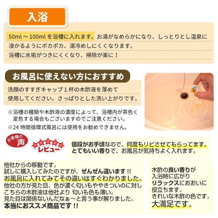 ※入浴に利用できない場合は、キャップ一杯の木酢液を洗面器に入れ、風呂上りに体にかける利用の方法もあります。