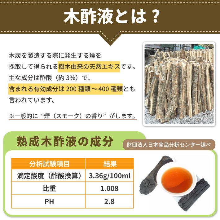 ※木酢液は一般的に煙の香り(スモーク臭)がします。