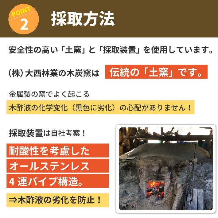 大西林業の木酢液は発がん性検査済み。木炭の製造過程で採取できる、貴重な炭のエキス。
