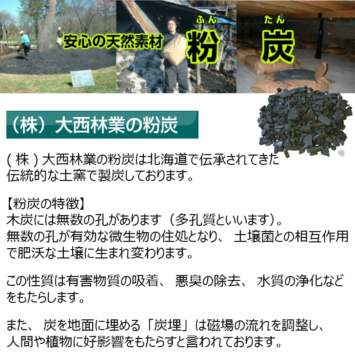 ・北海道の楢が主原料。作業の過程で砕けるなどした木炭を粉砕したのが「粉炭」です。